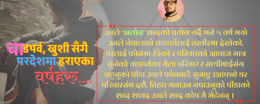 जब चाडबाड आउँछन्, परदेशीले देश सम्झन्छ । भदौको कुशेऔँसी हुँदै जब स्वदेशमा चाडपर्व सुरु हुन्छन्, त्यस बेलादेखि परदेशीको मनमा बेचैनी हुन्छ । जन्मभूमिमा खेलेका, हुर्केका साथीभाइ, ...